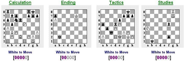 Examples below are regularly used in my training sessions. Please feel free to try them. However, you should keep in mind that level of difficulty in these examples range from beginner (1000+) up to senior master (2400). Don't be discouraged if you couldn't do the positions. Please check my suggestions below. If you become my student, you will get specifically designed set of training positions that will help you to progress gradually. Also, I am in the process of designing generic training sessions for various rating levels. Make sure to check back later or e-mail to be placed on our mailing list. Good Luck!